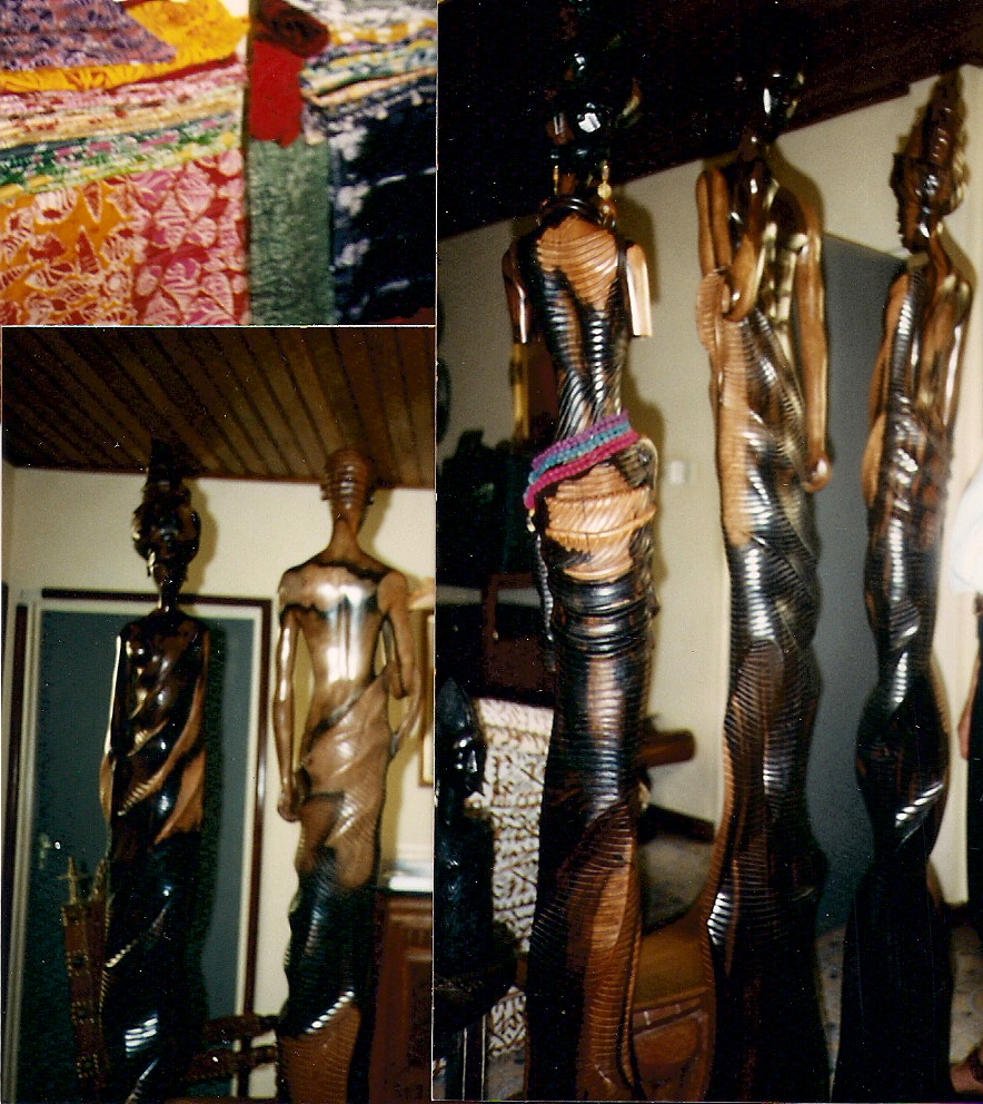 I am immediately struck by the dignity and intrinsic beauty of every single thing in this room. There is a sense of history emanating in unison from all objects, pictures, every piece of furniture. The room is large, rectangular. The three statues, easily seven feet tall, and in circumference about half the waist measurement of the skinniest international model, are a feat of equilibrium in themselves. They stand in the centre of the room dividing yet uniting the two carefully mapped out conversation areas, each of which has an eclectic composition of hard and soft furnishings. There are photographic portraits of family on the wall. I am delighted at this understated yet powerful display of a deeply-rooted African identity casually overlaid upon remnants of a bygone era that without question have been in this family for a number of generations. Here is someone who knows how to hang pictures! How wonderful it must be to have a heritage such as this!