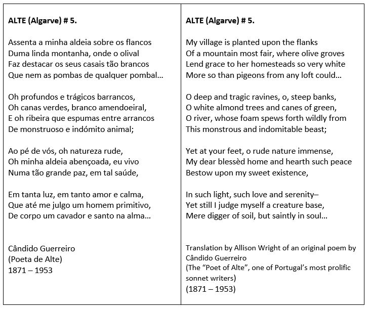 You may be interested to know that Paula Martins (prof of tourism/university of Algarve) and others have recently created a literary trail around Alte in the form of a booklet. It celebrates the life of Candido Guerreiro and his poems feature in this booklet. (translated poems in English version). We know Paula having stayed in her house for many years. She has asked us to translate various things (including poems by Joao Lucio) into English for her, not that we are Portuguese speakers, but have absorbed enough to do the job. I wish she had asked us to translate her short booklet.