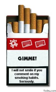 The main reason I will not smile is because I sincerely believe that the world is a wonderful place full of infinite variety, thus providing countless more interesting topics of conversation than the fact that I am smoking one after the other in a social situation.