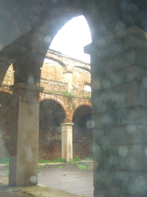 On the way home, we stop at an old convent (Convento de Santo António – Convent of Saint Anthony) in the hopes that an exhibition we both wanted to see is still open. The exhibition is finished, and a musical concert is about to begin. It is a wonderful building, with high rounded arches and a sense of glory somewhat incongruous with the modest crowd now assembling. I have time to explore, and through a glass door bedecked with raindrops, take pictures of the former cloisters.