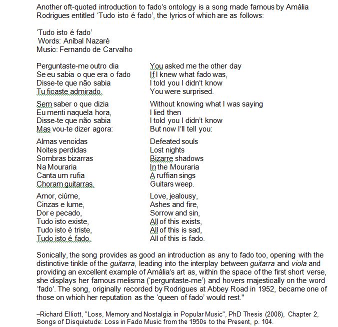 I offer you below an excerpt from the 2008 doctoral thesis of Richard Elliott. Chapter 2 can be read for free on the Internet. I offer this merely to make the point that even an accurate translation (although by no means a transcreation) of the lyrics of this very famous fado can never hope to convey what it is to hear it.