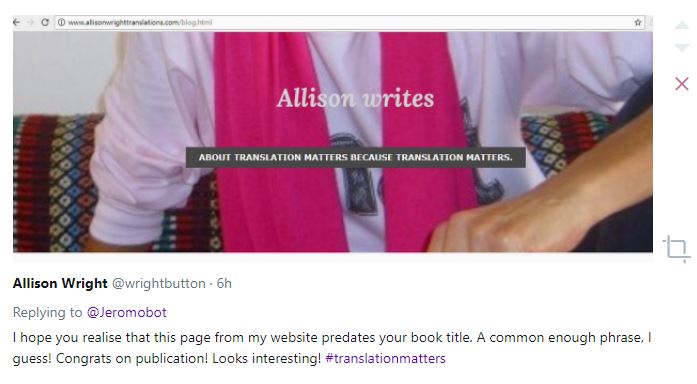 Jost Zetzsche, aka @jeromobot, has just published a book, without a co-author this time, entitled Translation Matters, available on Amazon. My TwitFeed told me this last night, which necessitated my putting the record straight immediately: