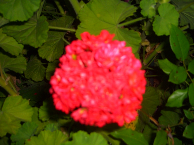 The camera with its flash captures an image of the flower that I do not see. What I see are numerous dull red ball-like flowers in the dawn half-light. My motivation for taking these photos was complex: it had to do with neglecting to capture the glory of the lemon yellow day lilies during the five days they flowered. So here are the geraniums, despite my dislike of them. My grandmother swore that they kept snakes away.