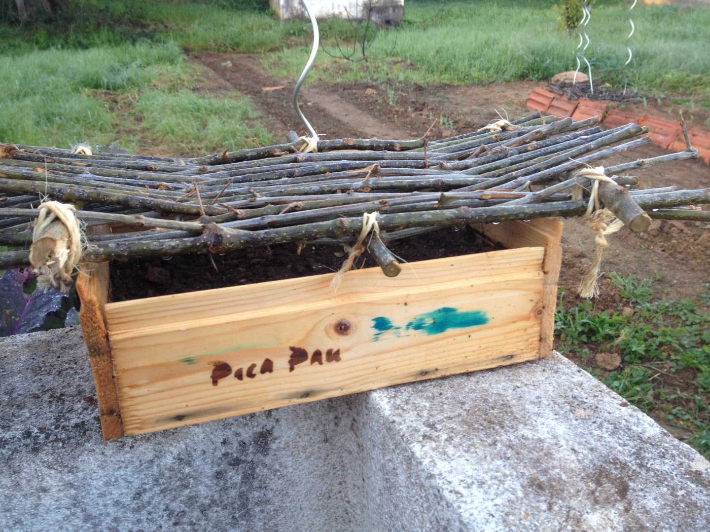 Yesterday I planted a little box of what will be onion seedlings. I was ever so pleased with myself, for I made the box, and the anti-frost covering woven from bits of new olive suckers from the beard of the olive tree. Not only that, the soil is the product of worms chewing through all sorts of green matter in the tin bucket with holes embedded in my raised bed made out of pallets.
