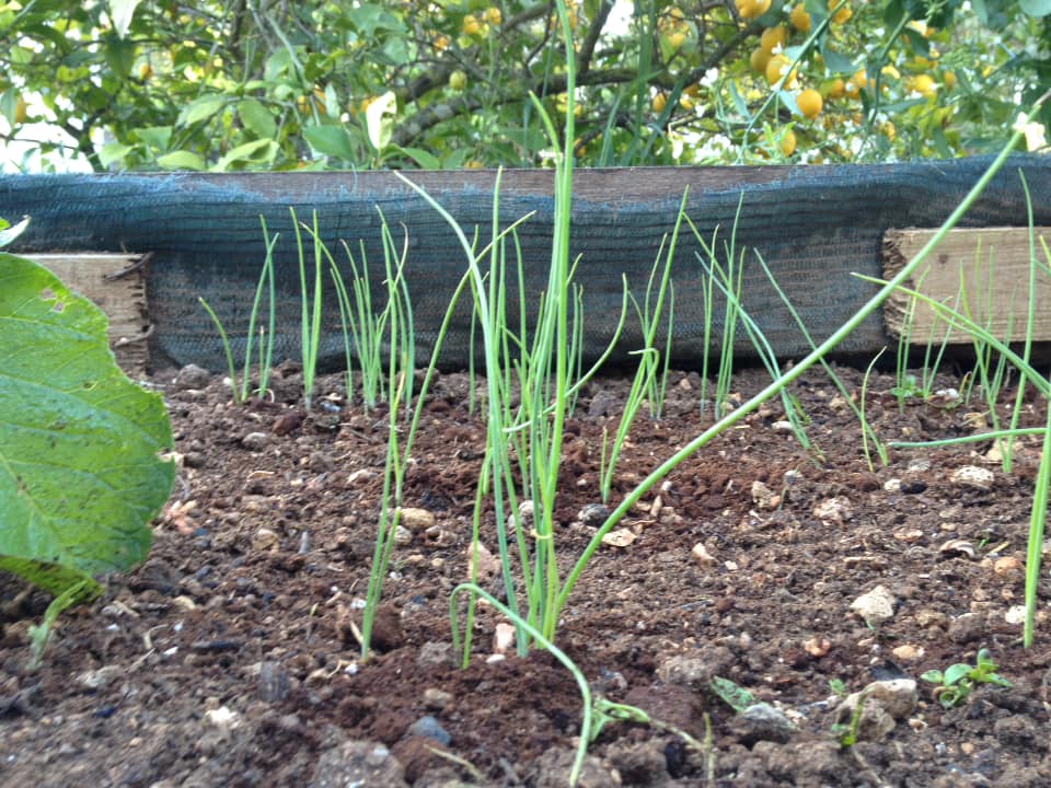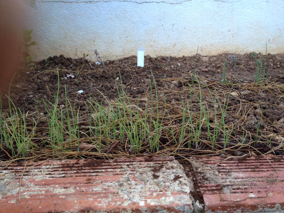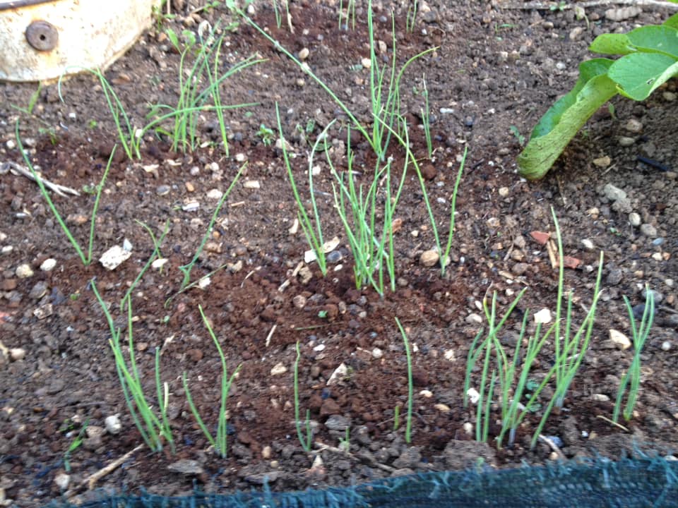 The fallen onions were duly cared for, and partially protected from the frost and the sun by thin olive branches woven together, and have done quite well so far, considering slugs were a problem for a while.