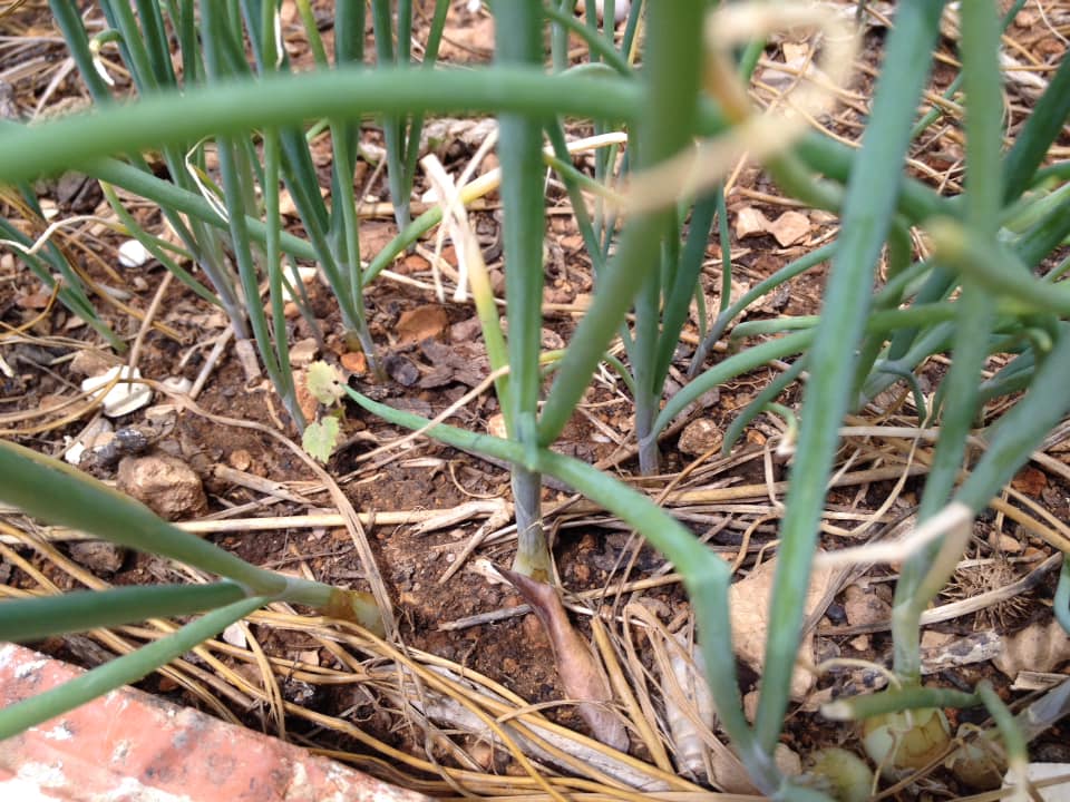 Yes, I am talking about onions. A few days ago, I became aware of a few little round onions the size of marbles sitting above ground. More followed suit in the next couple of days. These are the fallen onions making their presence felt.