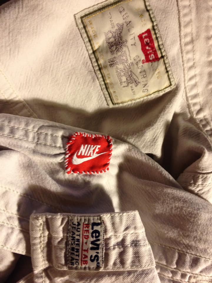 This results in brand confusion. The image below illustrates what happened to my favourite white shirt. I roped in a Nike label and stitched it to the reverse of a tear in the pocket. It was important to me to get the red and white to match the red and white Levi’s label on the front of the pocket (not pictured here), since I often wear these shirts with the buttons undone.